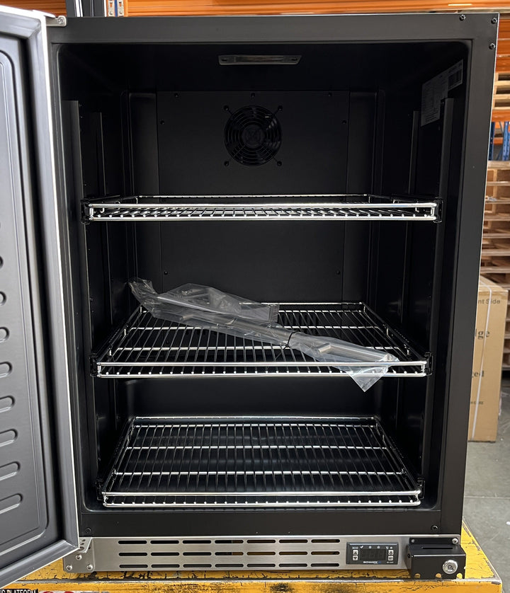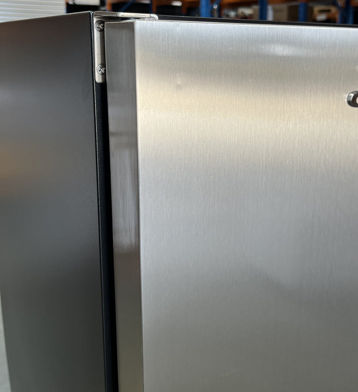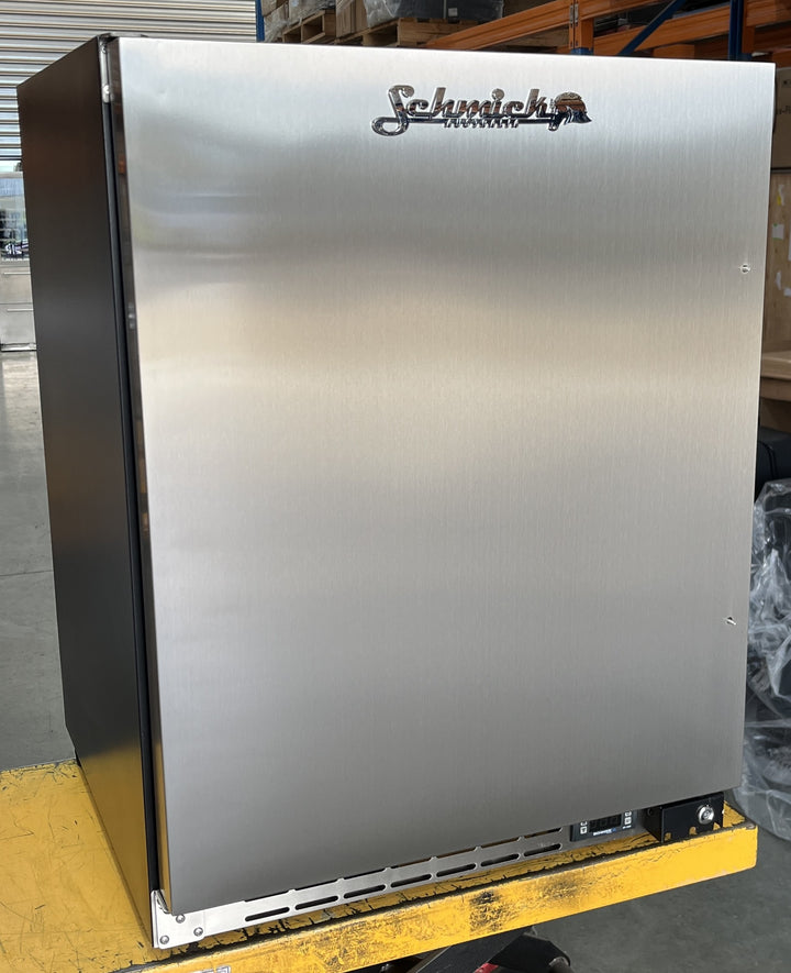 Product Snapshot | SCRATCH & DENT This unit was a showroom model. It has some very light marks on the right side and also on the top. These are hardly noticeable but if the unit is going under a counter these will not be seen at all. There is however a very small dent near the top left corner of the door which will be seen. Otherwise the freezer is in perfect working condition. As this has no packaging it can only be picked up instore at Alfredton 3350 or delivered locally by BFA ( Melbourne, Geelong, Ballarat and surrounds.) Classy front venting under bench quiet running bar fridge with low energy consumption. Unit has solid stainless steel door with lock, Schmick ECO energy saving controller, quiet running special Schmick brand fans and very versatile shelving options. The shelving is heavy duty chromed and fully adjustable, wine shelving can be added. Unit gets airflow from front grill so it can be built under benches for a sleek look. |