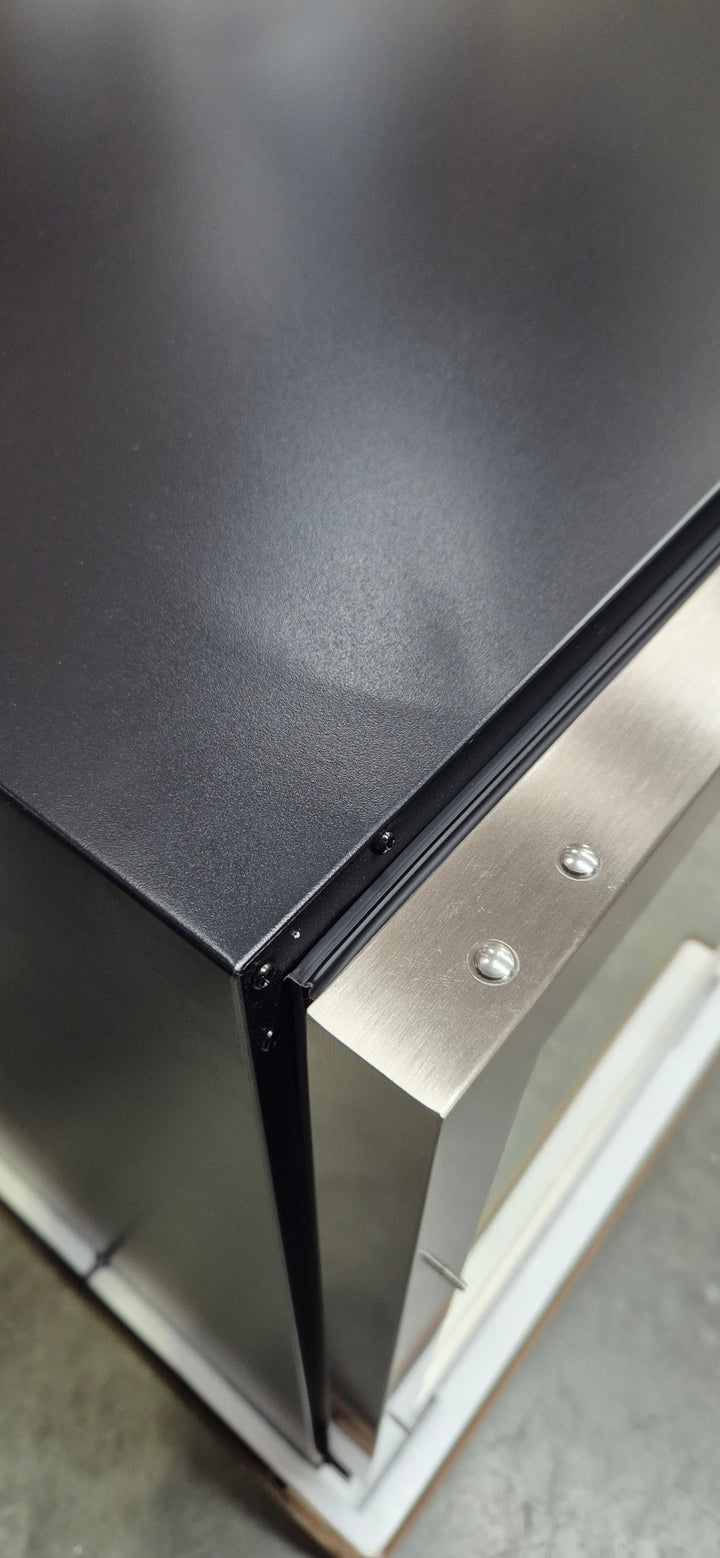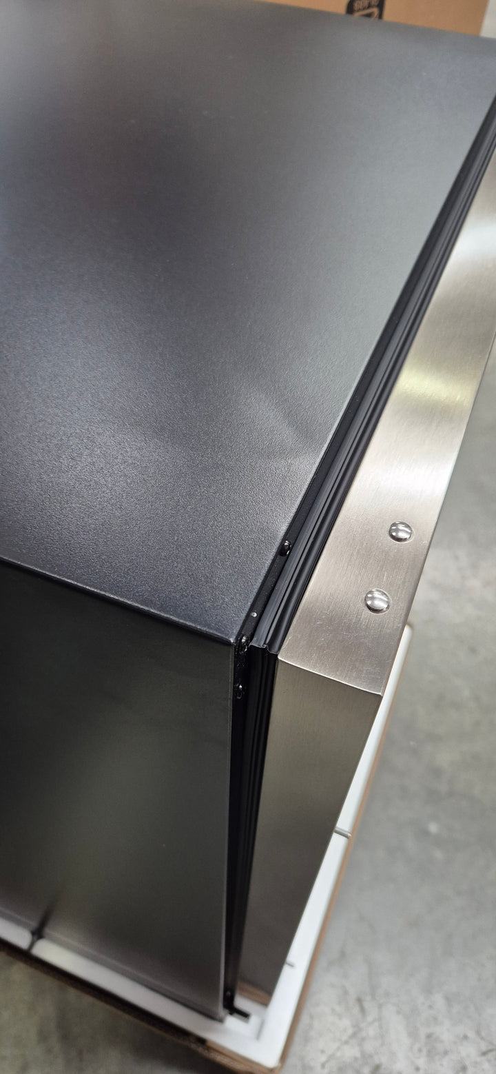 | Product Snapshot | This unit has unfortunately coped a knock in hte warehouse. Please see photos of the top panel If is VERY VERY minor. Otherwise, BRAND NEW in eery sense. Grab a bargin! Glass door under bench front venting wine fridge with triple glazed LOW E glass, quiet fans and German electronic controller. Shelving is a unique patented rubber saddle type that allows all-size bottles to fit on one shelf. German ECO controller allows 'ECONOMY' energy saving mode while away. Low E glass helps prevent condensation, the door is seamless stainless steel, reversible with lock, and the unit has a matching beer fridge available, model JC132B-860.  |